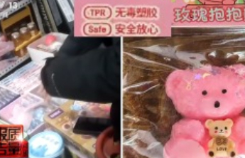 在一家店铺,记者看到一款名为“玫瑰抱抱熊”的捏捏乐玩具,包装上印着“无毒塑胶、安全放心”的字样。
