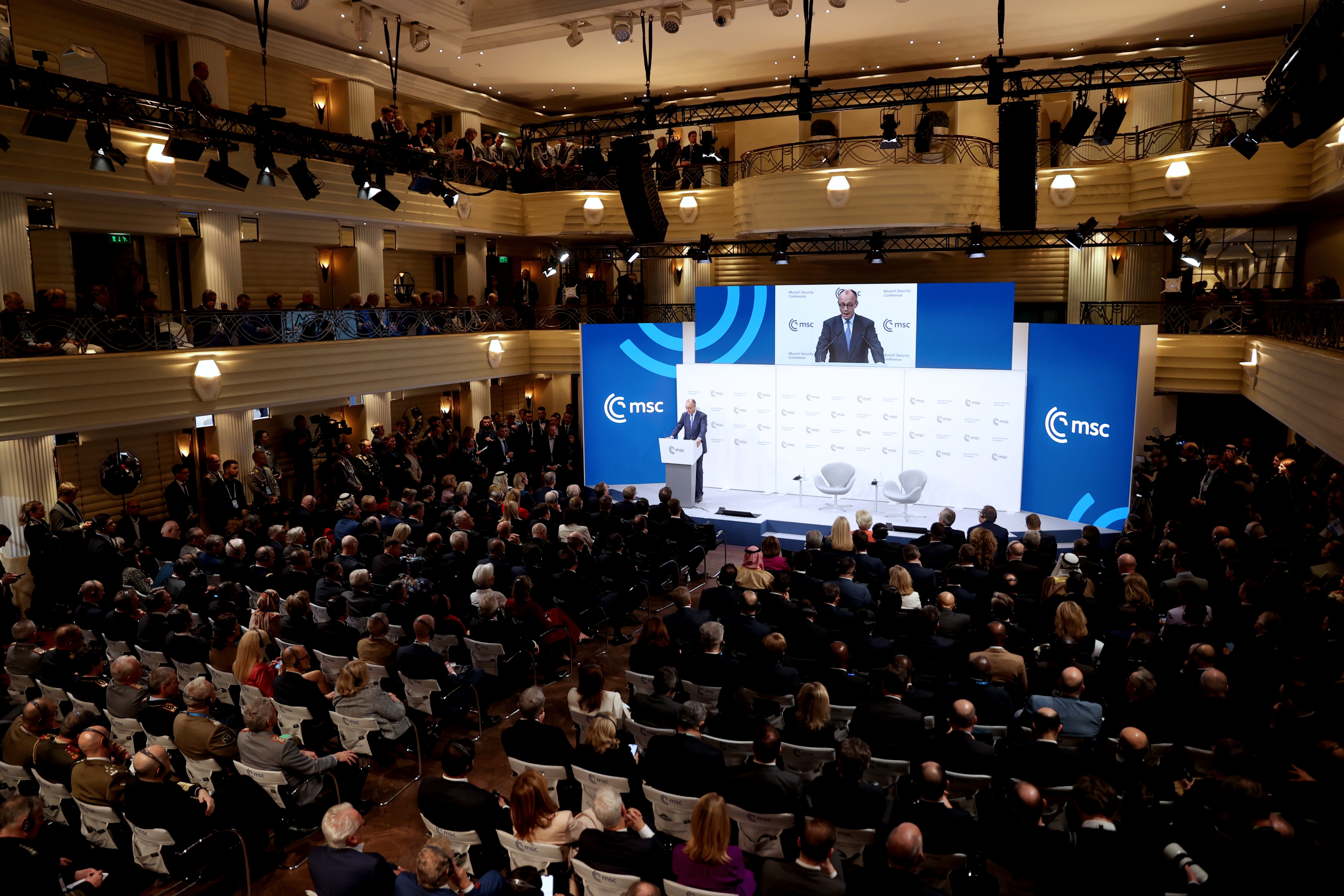 2月13日,在德国慕尼黑,德国总理默茨在第62届慕尼黑安全会议开幕式上致辞。新华社记者李颖摄